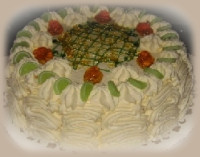 Del kakebunnen i 3 lag, dynk med melk eller sukkervann, ca. 2 dl. Lag vanilje/romkrem fra pose eller bruk ferdigkjøpt. Pisk kremfløten stiv med litt sukker. Legg vanilje/romkrem blandet med litt av kremen og bananskiver på det første laget. Bre 3-4 ss syltetøy utover det andre laget og dekk med krem. Sprøyt resten av kremen på kaka, bruk gjerne sprøytepose. Pynt med f.eks. gelefrukter og pyntegele.
