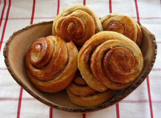 Lag vanlig gjærdeig og forhev til dobbel størrelse. Kjevle ut deigen til et rektangel ca. 20 x 70 cm. Lag fyllet og bre det ut over leiven. Rull sammen og skjær i 3 cm tykke biter. Sett dem i form. (sandkakeform eller muffinsform) Dekk til og etterhev i 1 time. Pensle med sammenvispet egg og dryss med hakkede mandler. Stek ved 250 grader i ca. 5 - 8 min. midt i ovnen.