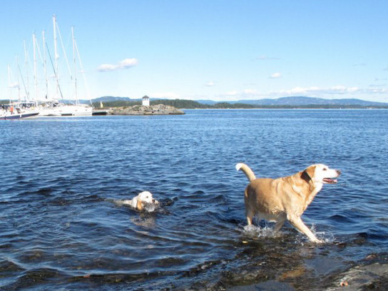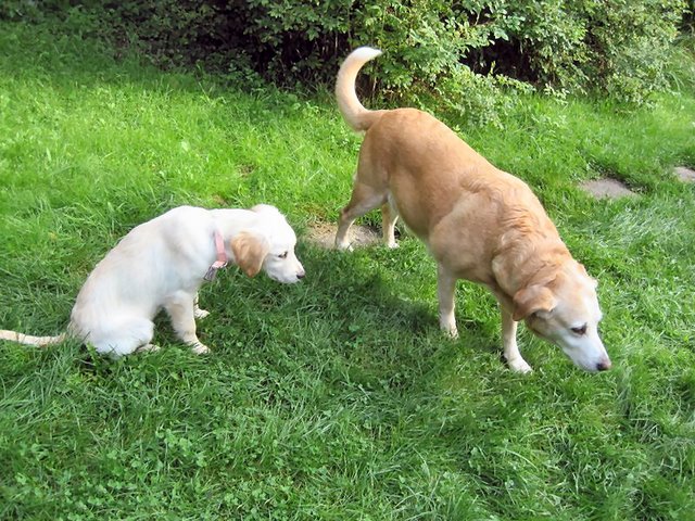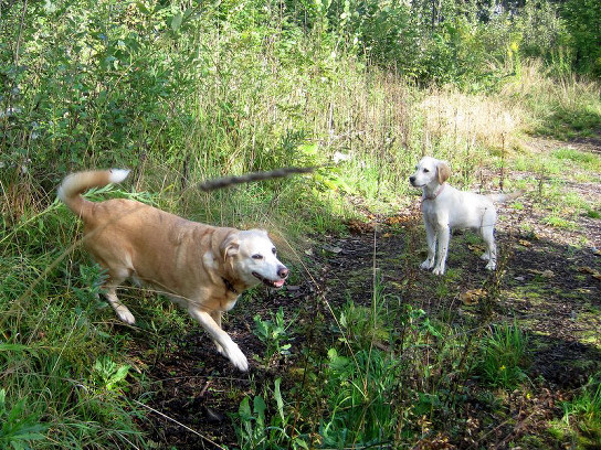 Laika har fått glimt i øynene igjen og vi ser at det var godt for henne å få en ny liten hund i huset! Tanja dilter etter henne over alt.. Hun lærte fort å gå i bånd og Laika går foran med et godt eksempel:) Hun har også lært å sitte når vi ber henne om det, og hun lyder navnet sitt. Jeg har undersøkt om valpekurs og i midten av oktober begynner vi på kurs, samme sted vi har gått før og har veldig god erfaring med, så det skal bli fint!