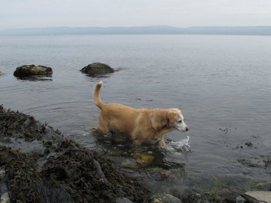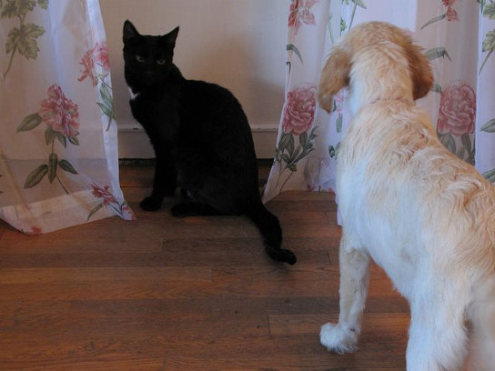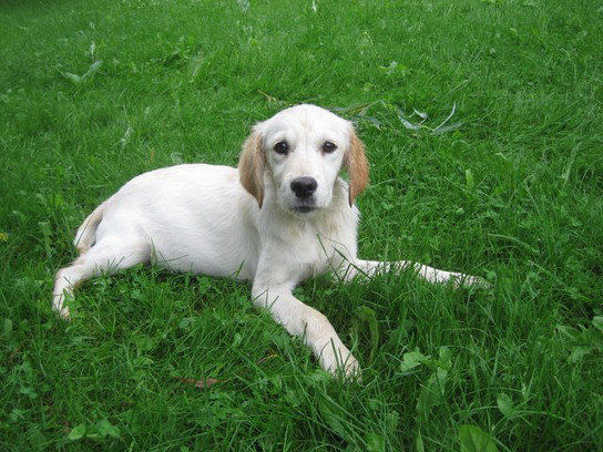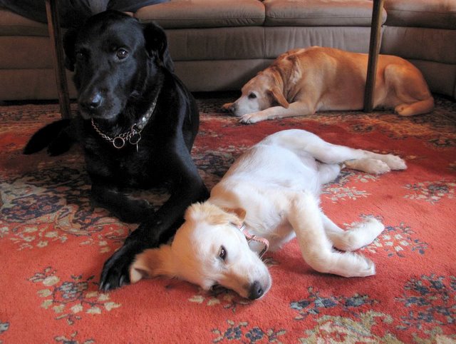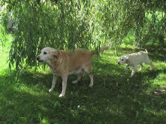 Endelig har vi funnet akkurat den valpen vi har ønsket oss og på lørdag 29. august dro vi avsted for å hente henne hjem, ei herlig lita goldenretriever/labradorjente på 4 1/2 måned. Hjemreisen gikk fint, 2 timer i bil for første gang var ikke noe problem når hun fikk sitte trygt og godt i fanget:) og hjemme ventet Laika og kattene Saxo og Snorre! Vi var veldig spent på hvordan de ville reagere på hverandre. Tanja hoppet og spratt så glad og fornøyd rundt omkring og forsøkte å nærme seg de andre, men Laika var ganske skeptisk til å begynne med overfor denne viltre lille nykommer'n og ville ikke slippe henne for nært innpå seg, men etter et par timer ble nysjerrigheten for stor og hun måtte bort og lukte og snuse på henne.. senere på kvelden sovnet de ganske nært inntil hverandre. Kattene brydde seg ikke noe særlig, de er jo vant med hunder!Tanja er født på bondegård så hun er også vant til å ha mange forskjellige dyr rundt seg!